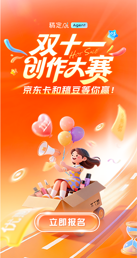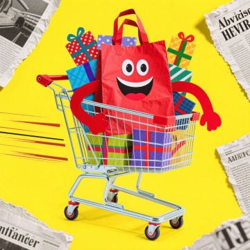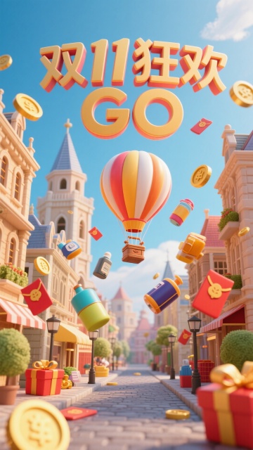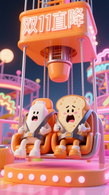 3D重拟物风格火箭载满零食飞向天空,融合波普艺术色彩与塑料质感,粒子光效营造未来科技感,双11促销主题鲜明,视觉冲击力十足。