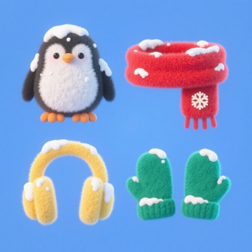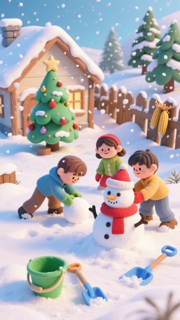 软3D粘土风格,卡通儿童雪地堆雪人,温馨可爱,喜庆圣诞氛围,温暖冬日场景。