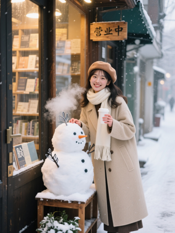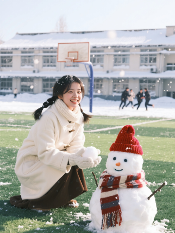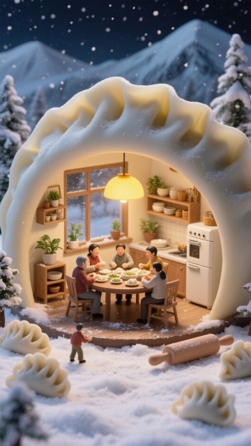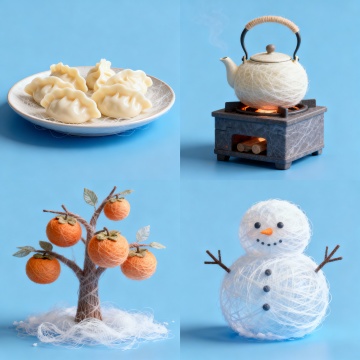 微缩艺术风融合毛发生长与粘土质感,轻拟物手法呈现温馨冬日场景:雪人、柿子树、茶壶与饺子,营造可爱梦幻的节日氛围。