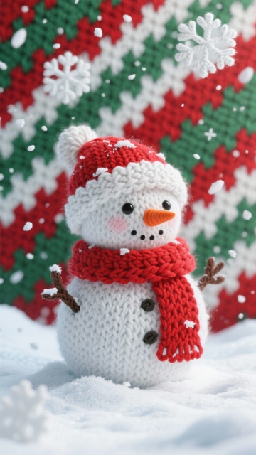 软3D针织雪人,毛发生长质感,拟人化表情,红绿圣诞背景,温馨喜庆,卡通可爱,趣味十足。