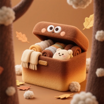 软3D风拟人收纳箱,毛发生长质感搭配暖色系面料,秋日落叶环绕,萌趣温馨,传递节日温暖氛围。
