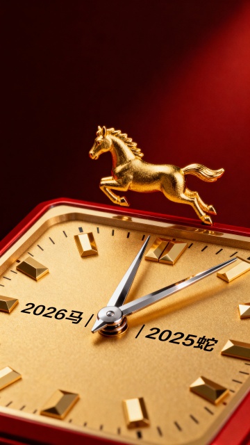 鎏金3D钟表,重拟物金属质感,金色骏马跃立其上,红金配色彰显中式喜庆与奢华,寓意2025蛇年迈向2026马年。