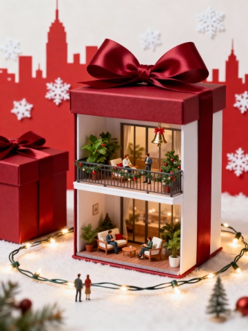 微缩艺术风3D礼盒屋,剪纸风城市背景与拼贴式雪景交融,红金配色营造喜庆温馨氛围,暖光灯串点缀梦幻圣诞夜。