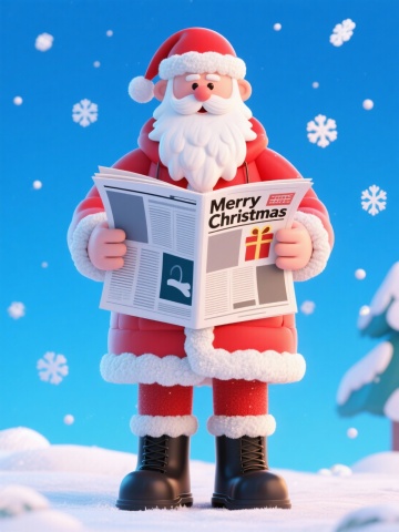 软3D粘土风格圣诞老人,手持“Merry Christmas”报纸,喜庆卡通感十足,雪景背景烘托节日氛围。