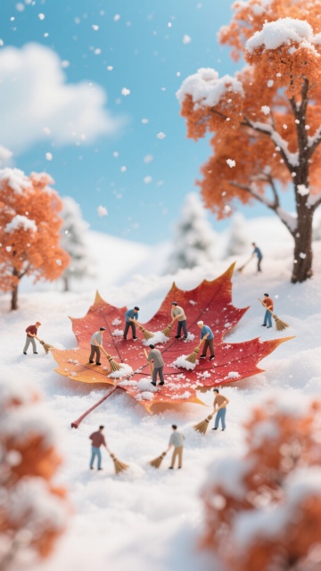 梦幻感微缩艺术风,拟人小人清扫枫叶上的雪,3D质感与水彩渲染结合,粒子雪花飘落,虚拟自然冬日童话。