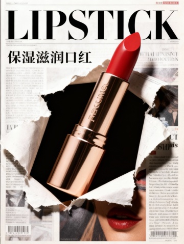 杂志风封面设计,撕纸拼贴手法呈现奢华金属质感口红,时尚感十足,融合保湿滋润主题,视觉冲击力强。