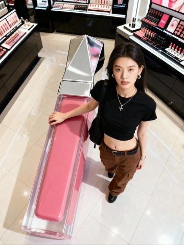 超大号唇釉装置,玻璃风与金属风结合,透明感与体积感并存,未来感十足的潮流场景,展现时尚与科技融合的现代美学。