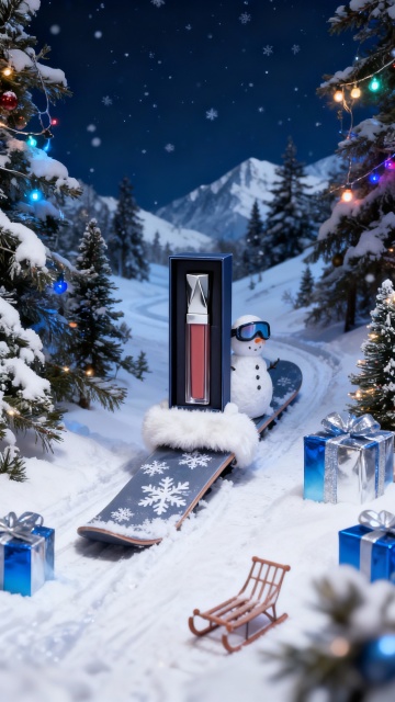 梦幻雪夜圣诞场景,3D微缩艺术风呈现温馨喜庆氛围,塑料质感唇釉置于雪橇之上,搭配玻璃感礼盒与发光彩灯,营造可爱趣味的虚拟现实节日美学。