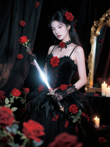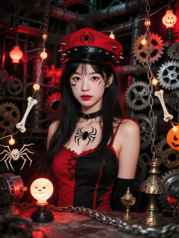 蒸汽波风与哥特风格融合,工业感机械背景搭配霓虹灯饰,金属质感齿轮与链条环绕,红色调营造万圣节神秘氛围,机能风服饰点缀蜘蛛元素,暗黑又炫酷。