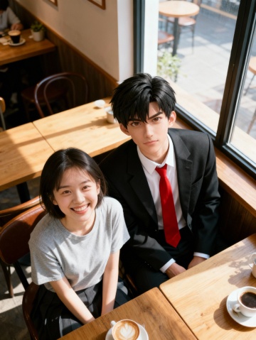 胶片风实景感,光影交织的咖啡馆角落,轻拟物设计融合动漫人物,营造温馨舒适氛围,商务与清新并存。