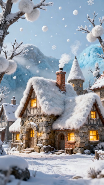 梦幻雪屋,3D微缩艺术风,毛发生长屋顶与石刻质感结合,温暖灯光透出温馨感,卡通风格冬日童话,虚拟现实中的可爱冬景。