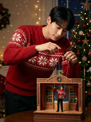 微缩木雕剧场中,皮影风偶戏演绎圣诞温情,红衣青年操控提线,喜庆与趣味交织,营造温馨节日氛围。