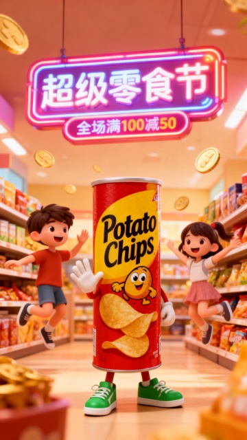 3D风城市夜景中,巨型发光洗发水瓶矗立中央,霓虹灯与礼物盒环绕,融合city pop风与超级符号设计,营造梦幻、未来感十足的宠粉节庆典氛围。