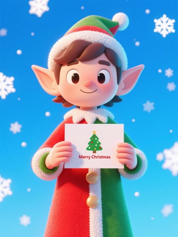 软3D风格圣诞精灵,毛发生长质感与面料纹理结合,卡通可爱,手持贺卡传递喜庆节日氛围。