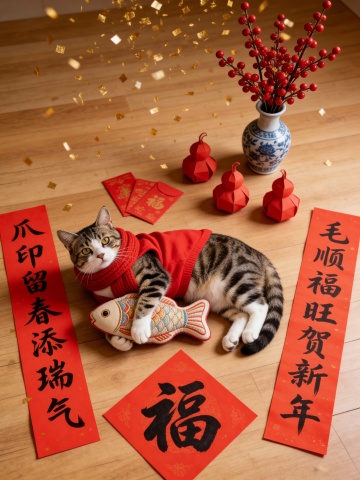 国潮风与轻拟物结合,猫咪身着红衣怀抱刺绣鱼玩偶,实景感十足,红金元素烘托喜庆氛围,融合中式对联、福字与青花瓷,呈现浓郁春节气息。