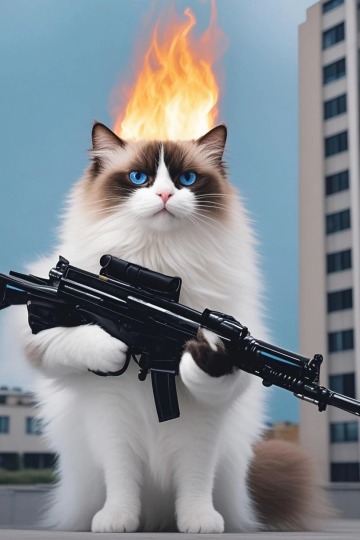 猫猫在大楼前很生气,头上冒火,拿着ak