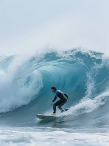 一名冲浪者在巨大的蓝色海浪中冲浪的特写,海浪形成壮观的拱形,浪花翻涌