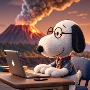 史努比对着电脑办公,背景是户外火山爆发