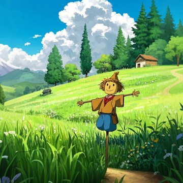 变宫崎骏风格,扁平,描边,简化的线条,背景换成蓝天和草坪,大片的云连接着草坪和天空