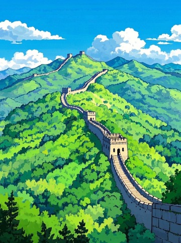 宫崎骏风格,动画风格,吉卜力,Hayao Miyazaki style,扁平,描边,北京长城,