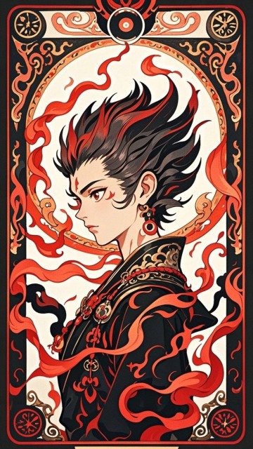 哪吒半身,站在画面中间,周围全是火焰环绕的纹样,红黑配色