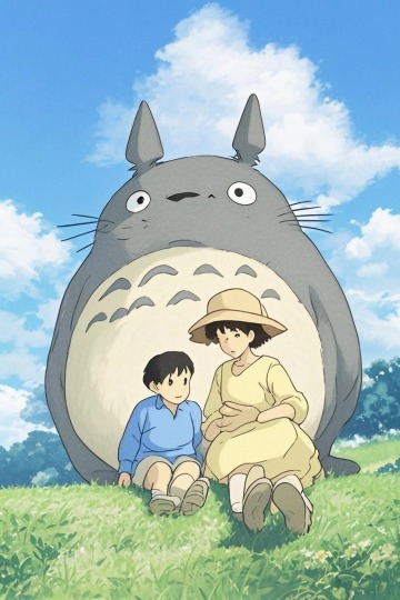 变宫崎骏风格,合理的结构,一只巨大的トトロ站在背后,母亲,儿子