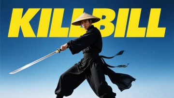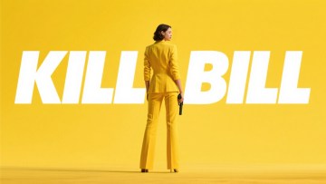 女杀手背影穿黄色套装,背后文字“KILL BILL”,黄色背景