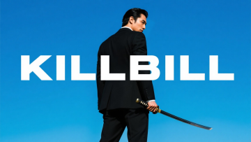 一个穿西服的男剑客,背面白色文字“KILLBILL”,蓝色背景
