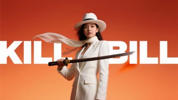一个穿着白色西装,戴着白色帽子拿着剑的美女,背后文字“KILLBILL” ,橙色背景