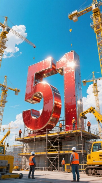 巨大的金属红色数字“51”,周围有起重机和工人,蓝天白云,CG概念设计