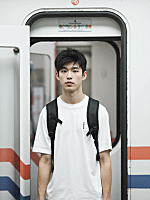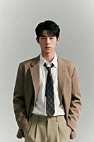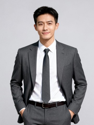 保留人物脸型、发型、年龄特征生成职场形象照,正脸照;人物居中,消除痘印,肤质优化处理提亮肤色,均匀肤色,干净的男士淡妆,气色自然,无明显浓妆痕迹;高级灰色西装,内搭白色衬衫,搭配深灰色领带,高级灰色西裤,暗色皮带;双手插兜的站立姿势,肢体自信自然,臀部以上半身像,表情动作自然,眼神坚定直视镜头,嘴角上扬,温柔,表情沉稳淡然;淡妆,柔和自然打光,画质清晰,头部完整,高清棚拍专业摄影人像写真,去除人物之外的所有元素,50MM标准焦段,F/4光圈(F/2.8-F/4区间),相机与人物距离2米,横向16:9比例(左右预留环境空间),人物占画面60%,入镜头部至膝盖上方5CM,平视视角,头肩比例协调,身形匀称,结构准确;光比1:1.5,4800K中性光,修饰脸型,肤质哑光细腻,面部雾面柔光,轻透裸肌感,真实毛孔纹理,32K画质,去除人物之外的所有元素,零噪点降噪,极简浅灰度纯色背景。