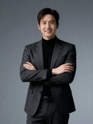 保留人物脸型、发型、年龄特征生成标准职场形象照,50mm焦段,F/4光圈(F/2.8-F/4区间),相机与人物距离3米,横向16:9比例(左右预留环境空间),冷白皮人物占画面60%,入镜头部至膝盖上方5cm,平视视角,人物居中构图,头肩比例协调,身穿修身深灰色西装,内搭黑色中领紧身针织上衣,同色系西裤,搭配黑色皮带,身形匀称,姿态端正;双臂交叉于胸前的姿态,肢体舒展规整,自信严谨,站立姿势稳重大气,主体锐利,双侧打柔和光,痘印精准去除, 肤质精细化处理;消除暗沉轻度磨皮,轻度美颜,均匀肤色提亮肤色,发梢微微修饰,眼神直视镜头,目光坚定且澄澈,表情自然.嘴角上扬,气质亲和感内敛稳重;均匀肤色,专业人像摄影写真,头部完整,结构准确;光比1:1.5,4800K暖调中性光,修饰脸型,肤质哑光细腻,面部雾面柔光,轻透裸肌感,真实毛孔纹理,32K画质,去除人物之外的所有元素,零噪点降噪,简约冷调中深灰度纯色背景, 雾面漫射弱反光。