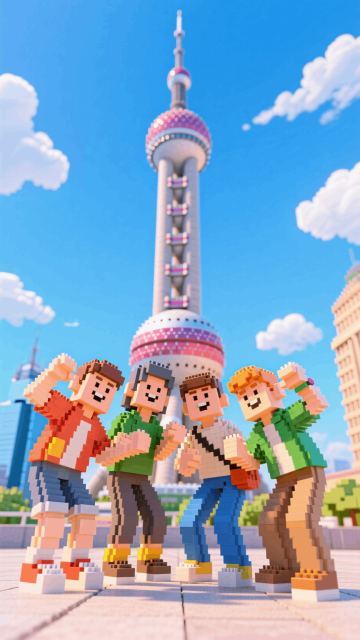 四个朋友摆着搞怪的姿势在东方明珠前合照,蓝天白云
