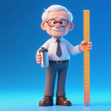老年男教师(拿保温杯和尺子,穿皮鞋),全身,元素完整。蓝色渐变背景