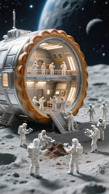 一个月饼太空站,停在月球表面,有很多宇航员在进行科学探索,背景是宇宙星空