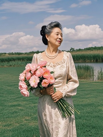 复古妆容,一名中年人,在草坪上手捧鲜花,背景为自然风光