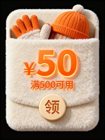 毛绒风格,一个米白色竖长方形扁平造型毛绒红包,里面露出毛绒手套,帽子,中心为“¥50”橘色大字,橘色小字“满500可用”;红包下方一个圆形米色按钮“领”。色彩明快(橙+白)。