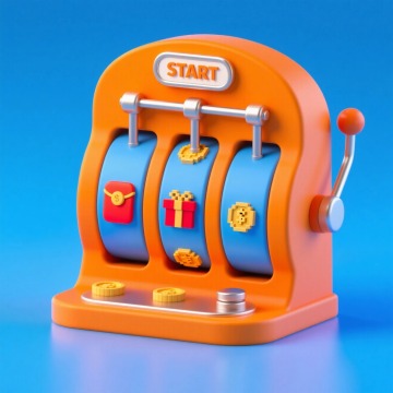 主体是完整的游戏抽奖机,正对着画面,不要有任何角度,金属拉杆,三组独立滚轮,里面是红包,礼物,金币像素图案,游戏机顶部"START"按钮,整体为橙色色调,蓝色背景。