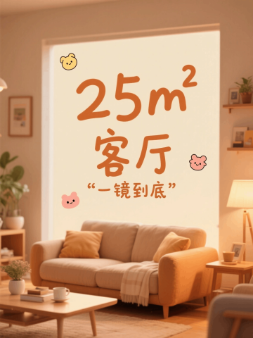 摄影风,背景为暖色调客厅,广角,主标题为"25m²客厅",副标题为"一镜到底",稚气感手写字,可爱元素装饰