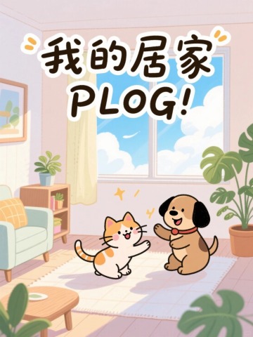 可爱手绘插画,一猫一狗在温馨家居角落玩耍,家具和绿植,趣味手写大标题文案:“我的居家PLOG”,窗外是蓝天白云,温暖治愈氛围。