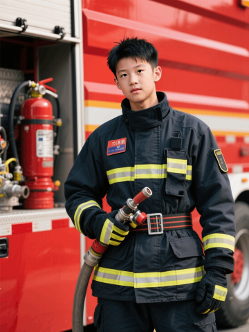 小朋友,女生,消防员穿搭,干净的背景,正视图