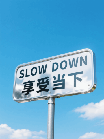 背景为蓝天,主视觉为一个大路牌,路牌上写着“SLOW DOWN 享受当下”