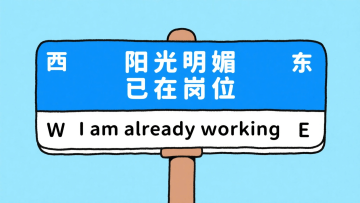 顶部蓝+底部白的路牌(蓝色区域:“阳光明媚 已在岗位”,左右上角分别标“西”“东”,白色区域:英文“I am already working”,左右“W”“E”方向),浅蓝背景