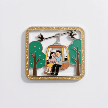 金属冰箱贴,一对情侣坐在缆车里,树木、飞鸟装饰,边框带有金色亮片
