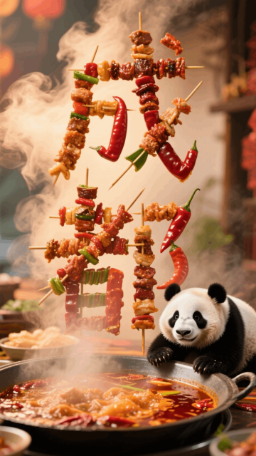 文字“成都”的所有笔画都由实物元素(烤串、辣椒等当地特色食物)拼接组合而成,熊猫装饰,背景暖色系的火锅