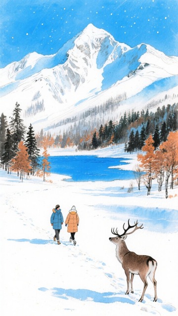 背景是巍峨的雪山,积雪覆盖的山峰出现在淡蓝色星空下,中景是一汪湛蓝的湖泊,周围环绕着茂密的森林,部分树木呈现出橙棕色,前景有一对穿着冬装的行人在雪地上漫步,右下角有一头麋鹿。