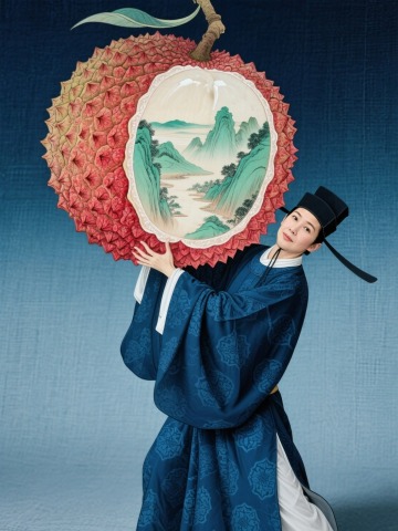 东方美学摄影视觉,古装人物真人(身着冷蓝丝绸唐代小吏官服,暗纹细节)负重举起一颗巨型工笔插画荔枝(宽度几乎撑满画布,外壳粗糙写实纹理,剖面嵌套工笔青绿山水意境,暖红晕染)的动态。简单干净的背景:用暗蓝色渐变到靛蓝(明显的麻布面纹理)