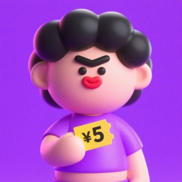 一个人手里拿着一张“¥5”黄色优惠券,浓郁紫色背景,蓬松的黑头发、超粗眉毛、黑色豆豆眼、超厚红嘴唇、表情呆萌的半身卡通人物,紫色上衣