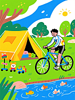 变宫崎骏风格,扁平,描边,简化的线条,背景换成蓝天和草坪,大片的云连接着草坪和天空