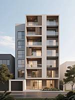 夏日午后,雨后场景,蓝天白云,有一道美丽的彩虹,街上有零星人群撑着伞,地面还有一点积水